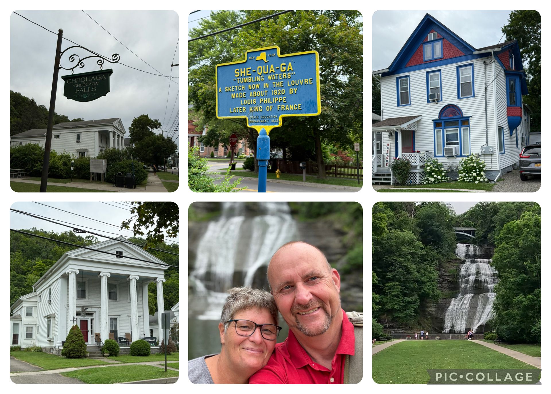 Dagens første stop efter 1/2 times kørsel var ved dagens første vandfald She-Qua-Ga eller Chequaga Falls. Uanset hvad det hedder, så kan vi ikke sådan lige udtale det. Det skulle betyde “Tumbling Waters”. Vandfaldet ligger nærmest midt i byen lige ved siden af nogle fine gamle huse.