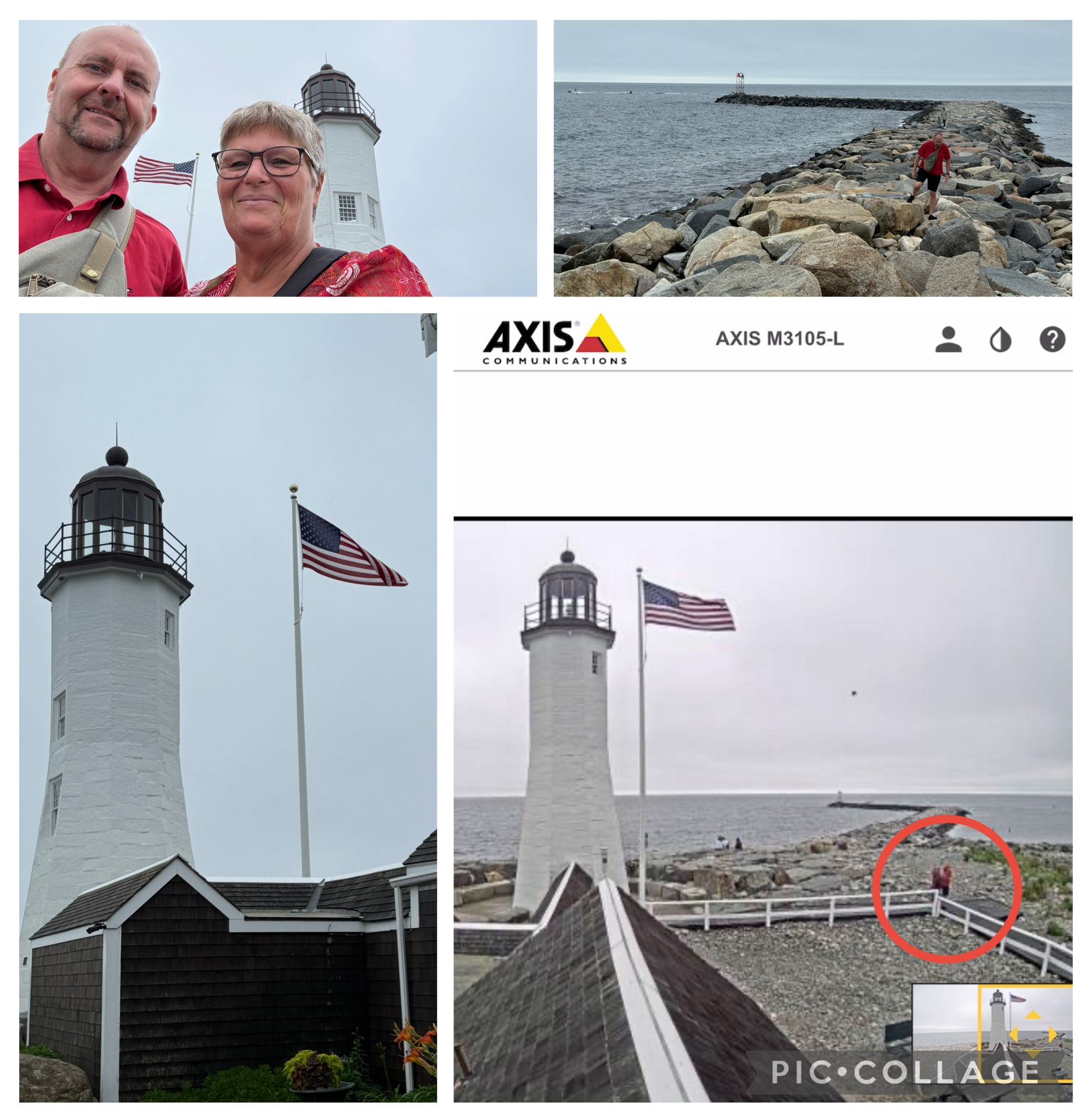 Turens sidste fyrtårn - Scituate Lighthouse - efter en time. Vi fandt lige ud af, at der sendes med live cam derfra, så derfor ser man to tosser vinke, mens de streamer og optager deres egen telefon skærm. Snap til børnene, der ryster på hovedet , og siger “KOM SÅ HJEM”.