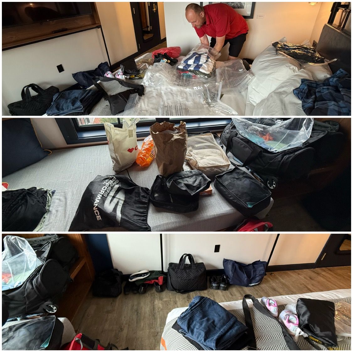 Nå mens vi ventede på, at det klarede op, kunne vi jo lige øve os på kunsten i at få alt det vi havde med, plus det vi har købt til at være i de 2 samme rejsetasker. Jo jo det gik, men vi har også købt en ekstra taske, og så tager vi også lige vores køletaske med hjem denne gang.