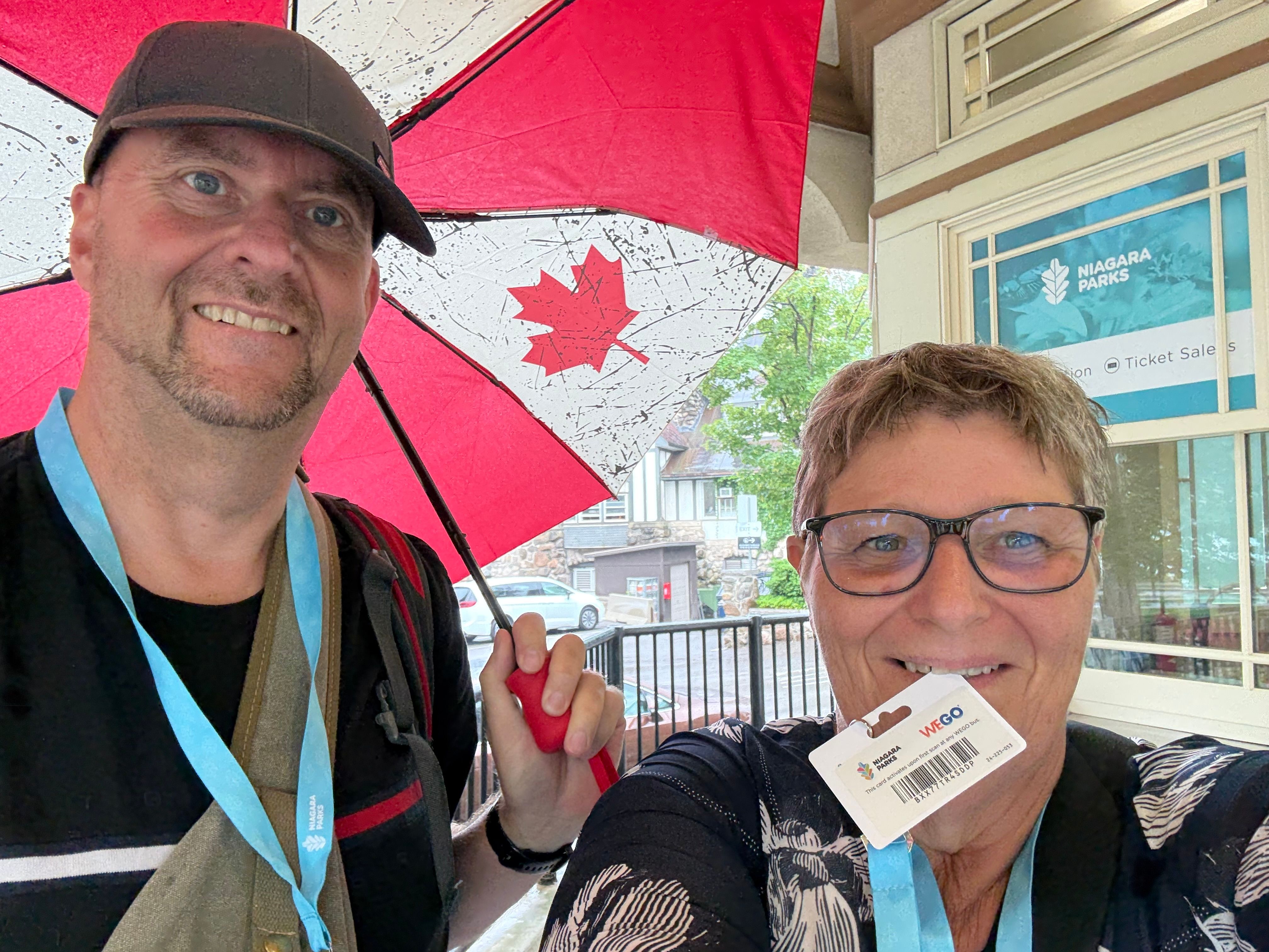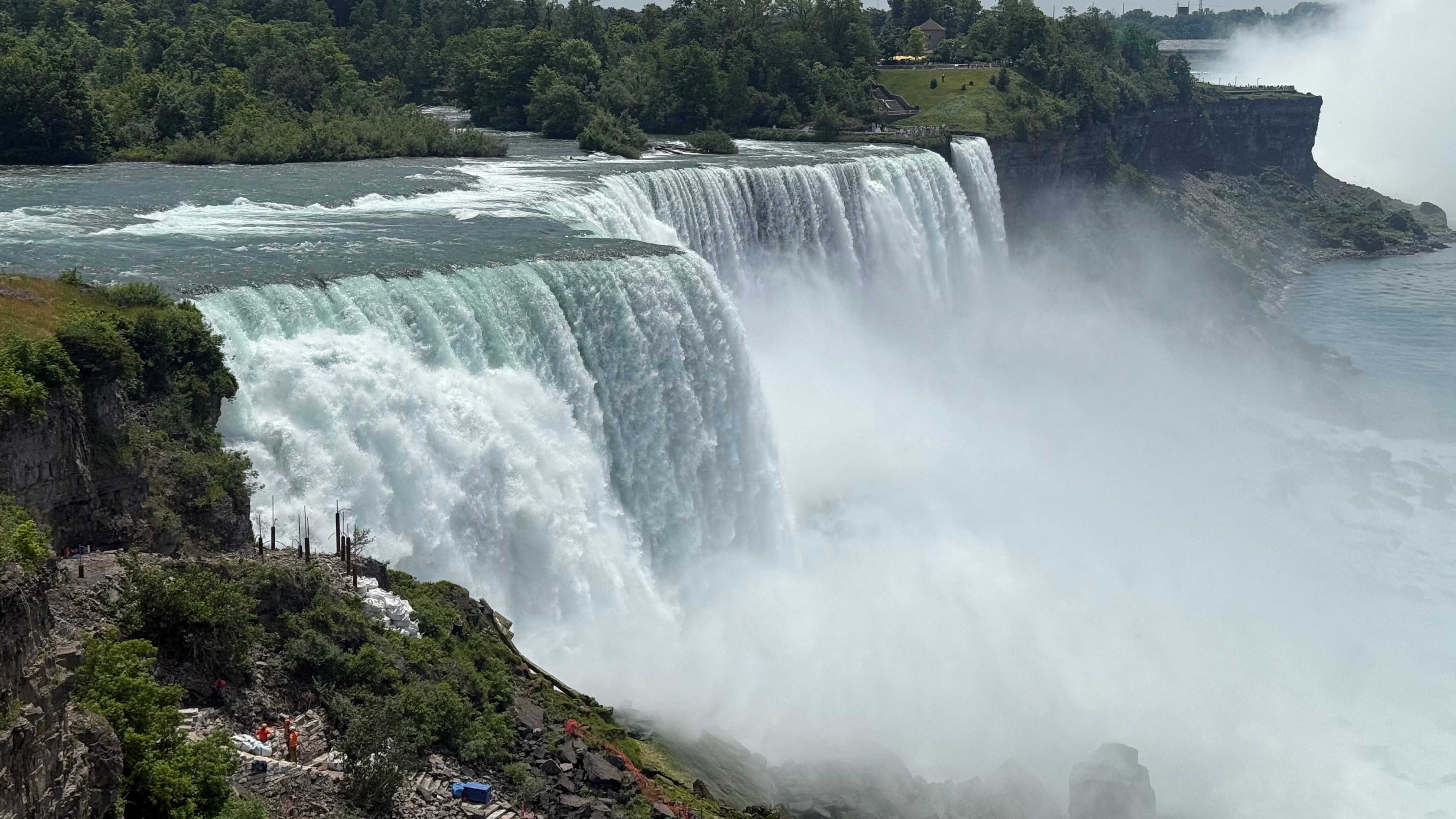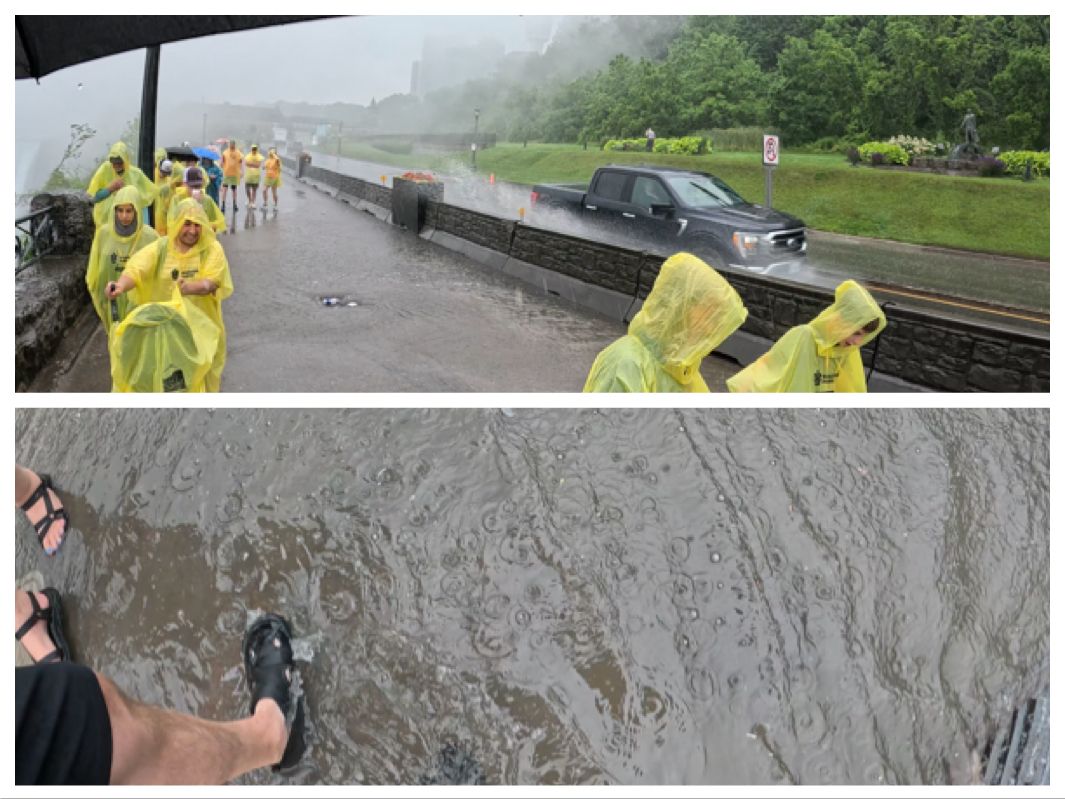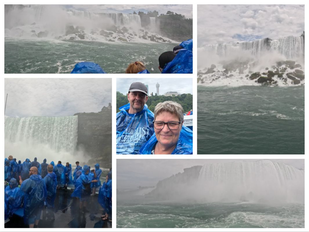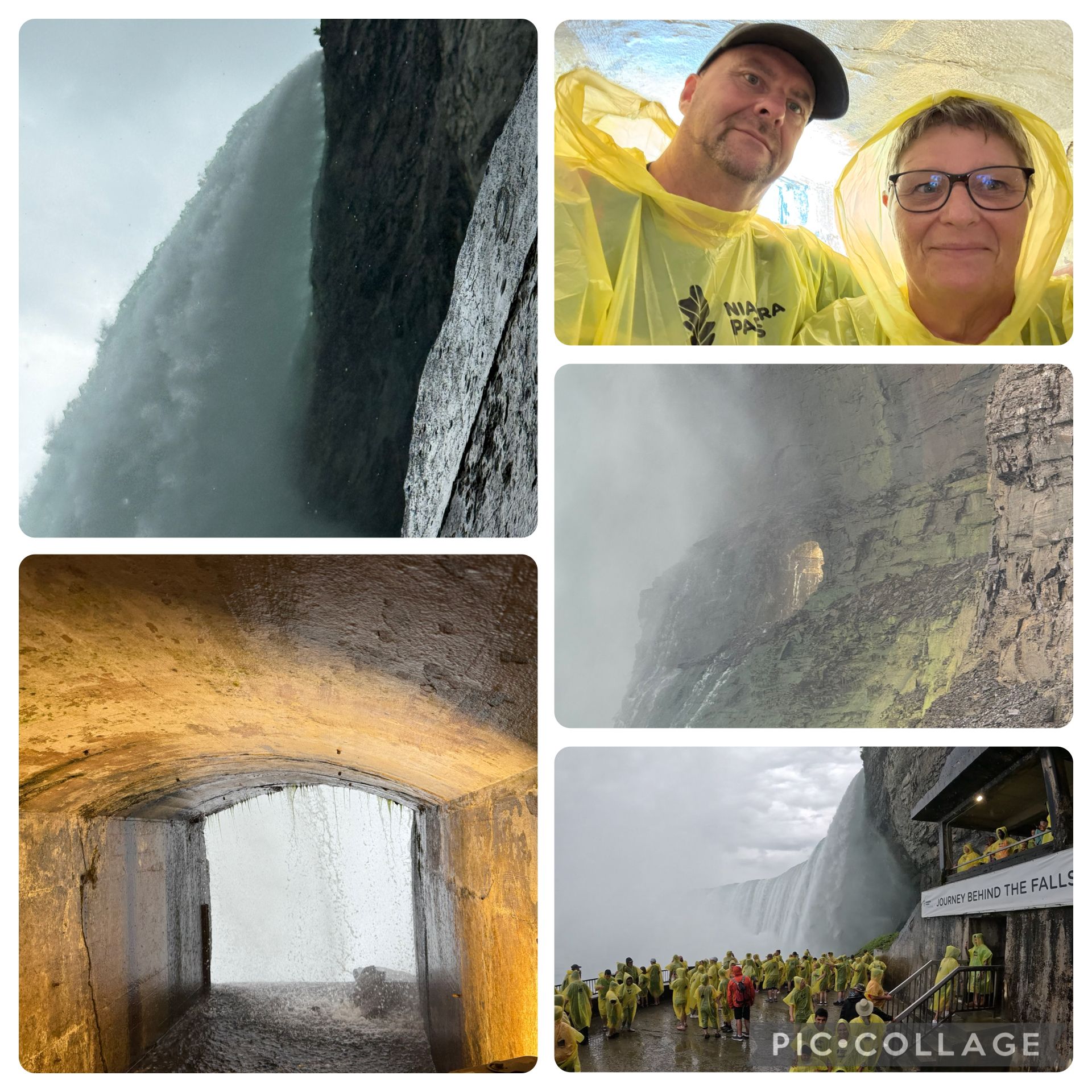 JBtF starter med en elevatortur på 38 m ned i klippen til et netværk af 130 år gamle tunneler hugget ud i grundfjeldet. Tunnelerne går til to udsigtspunkter, hvor man står direkte bag det brusende vand. Her kan man både se og høre og mærke den enorme kraft fra vandmasserne. Derefter gik vi til det udendørs observationsdæk ved foden af Horseshoe Falls. Her kunne vi se de 2.800 kubikmeter vand, der hvert sekund vælter ned med en hastighed på 65 km/t. Alle har gule plastic poser (ponchoer) på, og det er godt, for det var ret vådt. På et tidspunkt vendte vinden, og vi blev endnu mere våde.