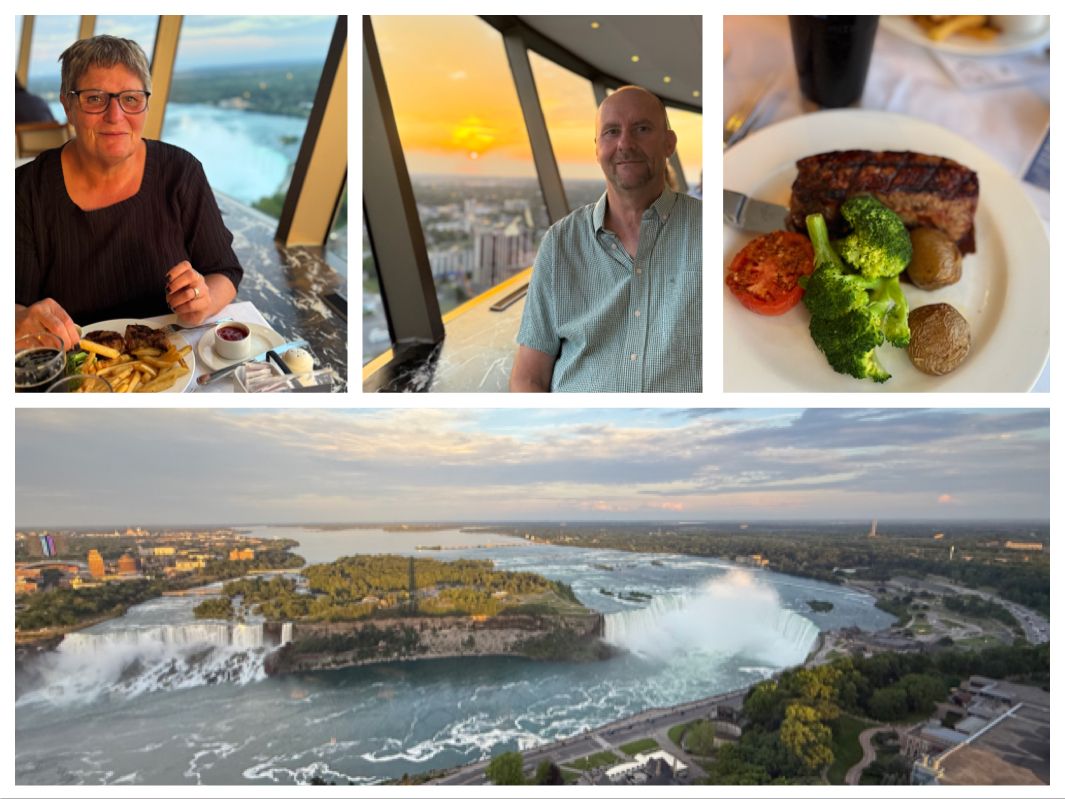 Vi havde bestilt bord hjemmefra til middag kl. 20.00 i Skylon Tower i deres Revolving Dining Room. Så på med kjole og skjorte, og op i tårnet i den udendørs elevator. Ham, der styrer elevatoren gør det 7 timer om dagen, og i hver tur (der tager max 1 minut) går han ned i knæ, hver gang udsigten over faldene dukker op. Han var ung, så han har nok stadig gode knæ.Fik rigtig lækker middag med drinks og steaks og kaffe, alt i mens restauranten kørte rundt. Vi nåede knap 2 gange rundt. Lidt vildt og maden var rigtig god.