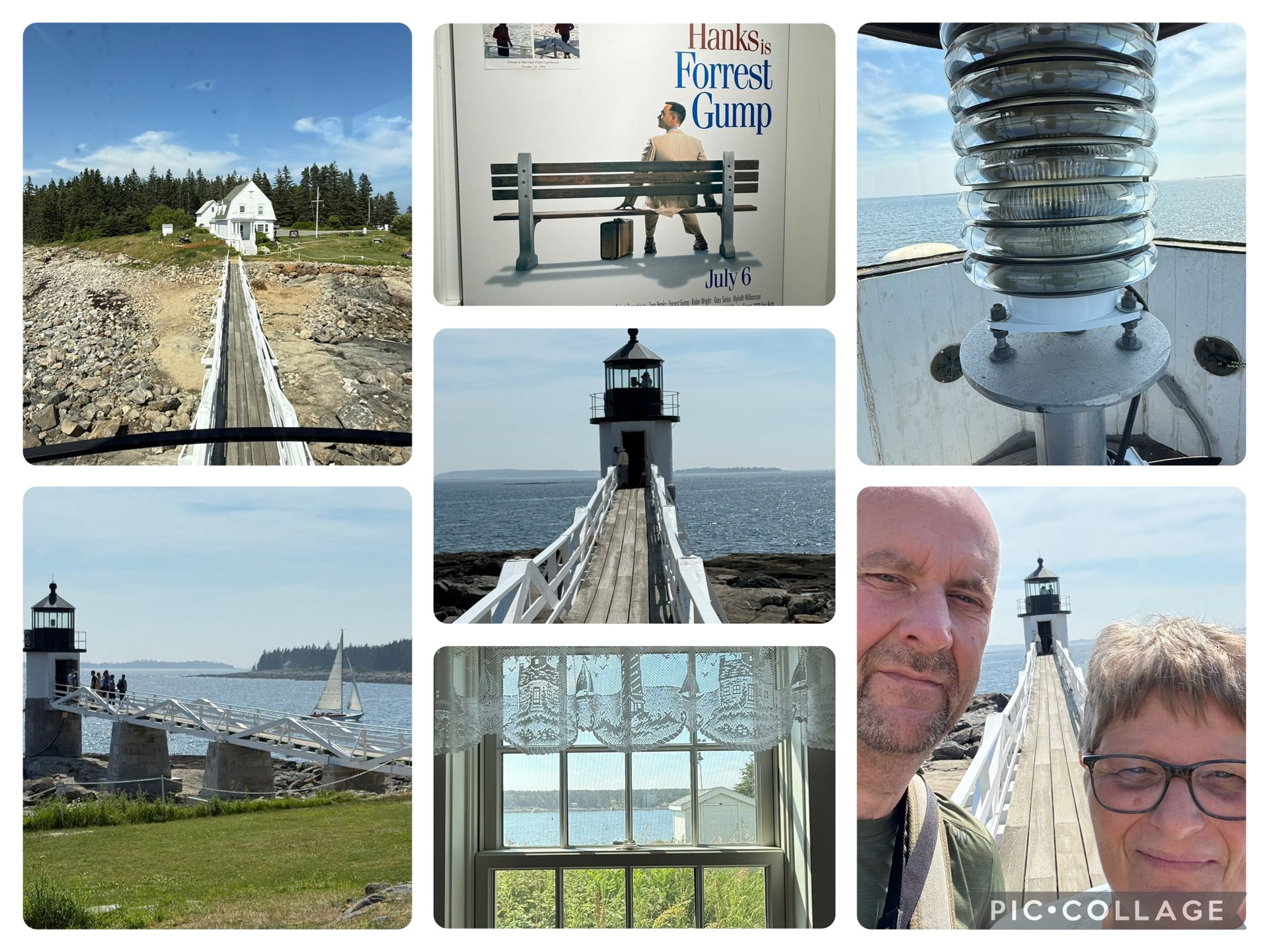 Næste og dagens sidste stop - var ved endnu et fyrtårn “Marshall Point Lighthouse”. Et fint lille sted, Vi gik ud af den lille bro, der i øvrigt senest var brast sammen under en storm for 2 år siden, ud til fyrtårnet. Op i tårnet for at se ud. Det var et meget lille rum.Der gamle pærer er skiftet ud med ledpære. Talte med “fyrmesteren” eller guiden og han fortalte, at selve fyret er ejet af byen Port Clyde, men selve lyset ejes af Kystvagten. Fyrtårnet er i øvrigt blevet ekstra kendt, fordi det var det fyrtårn, der var med i Forrest Gump, hvor Forrest løber helt til østkysten.