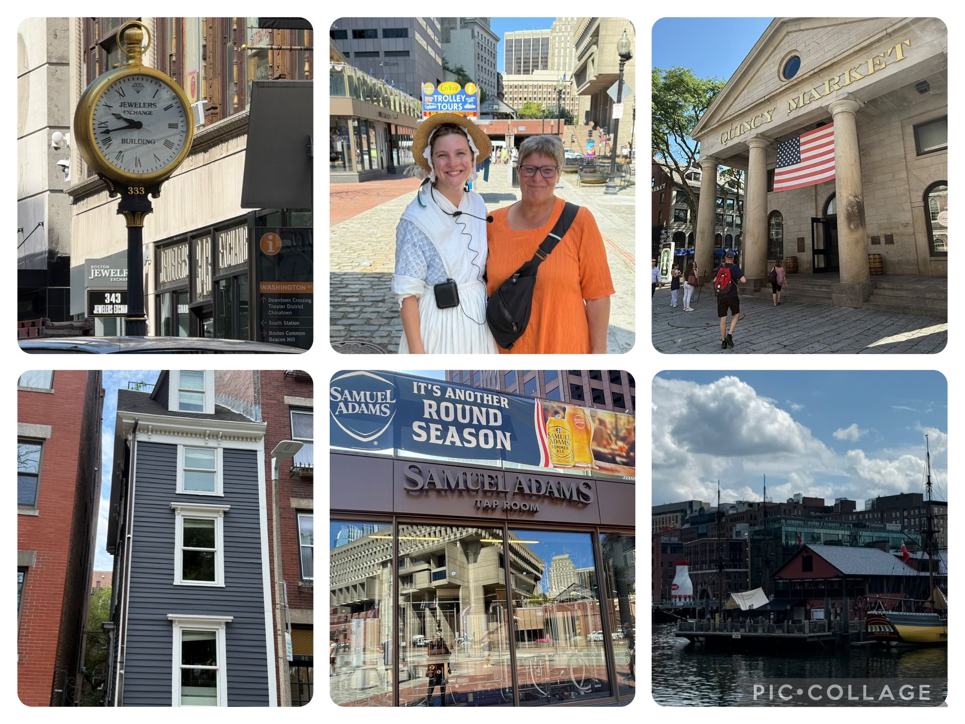 Vi kom også forbi Quincy Market og de to øvrige. Store haller med diverse madsteder. Sjovt at se, men lidt for tidligt til frokost. Vi kom også forbi “The Skinny House, der er efter sigende skulle have været en splid mellem to brødre, og derfor ligger dette lille smalle hus mellem de øvrige højere og bredere bygninger. Sidste stop på trailen var ved et museum for USS Constitution en amerikansk fregat, men der var vi meget varme, og man kunne ved siden af tage en båd, der sejlede i 10 minutter, som ville spare os for et par km retur. Og den kostede kun $3 pr person. Efter den korte tur på vandet i lidt vind, kæmpede vi os videre og fik en sandwich og lidt koldt at drikke og et hvil. Videre derfra gik vi til The Boston Teaparty bare for at se stedet. Vi sprang museet over. Det må blive en anden gang. Gik også lige forbi banegården, altid sjov at se i de større byer.