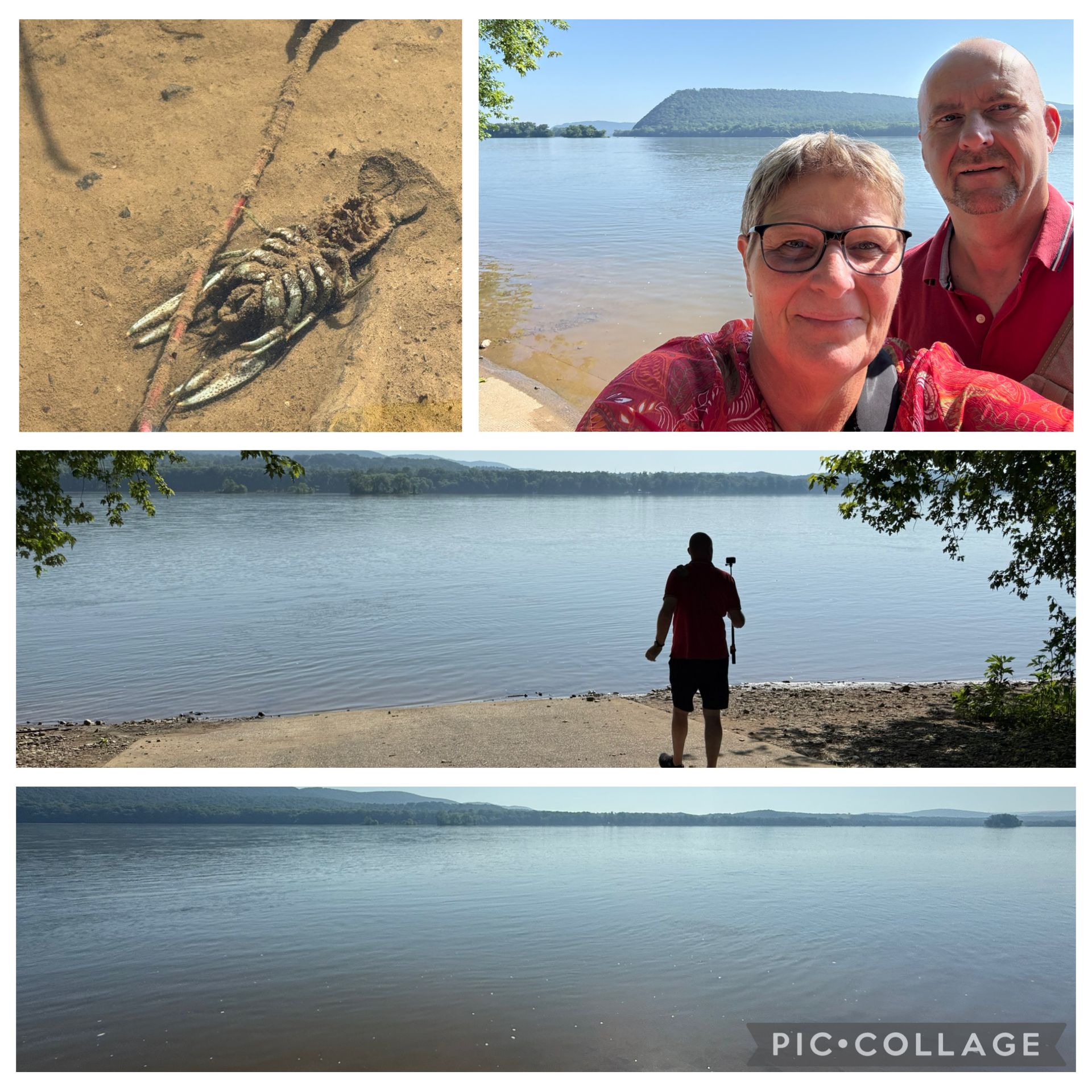 Afsted kl 8 i 29 grader. Efter en god times tid, gjorde vi stop ved den flod, vi efterhånden havde fulgt nogle kilometer - virkelig smukt og grønt og kuperet landskab. Susquehanna River er cirka 747 kilometer lang i alt, og den løber gennem tre stater: New York, Pennsylvania og Maryland. Vi øver os på at sige navnet - det lyder mest som sjuske Hanne (men det er der jo ikke noget, der hedder - det er kun Dorte der må sjuske).