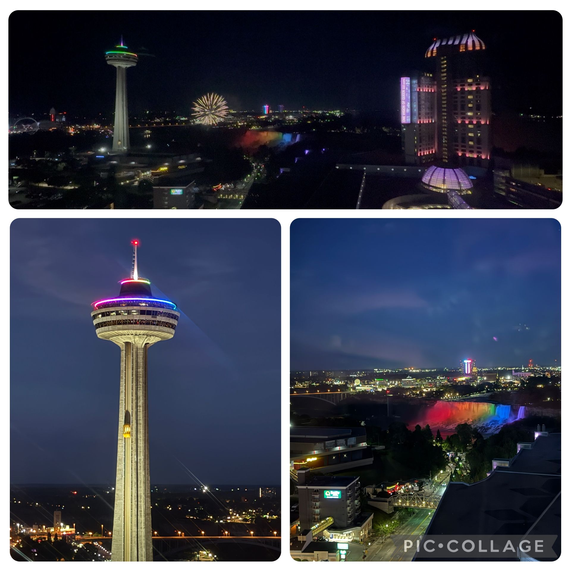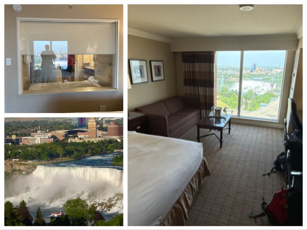 Tjekket ind på Hilton Niagara Falls/Falsview i et kæmpe værelse - nærmest en lejlighed med 2 soveværelser, badeværelse med spa og lidt køkken. Fuld udsigt over vandfaldene. Og for at det ikke skal være løgn, så kan man rulle et gardin op, så man kan ligge/sidde i spa’en og set ud på vandfaldene.