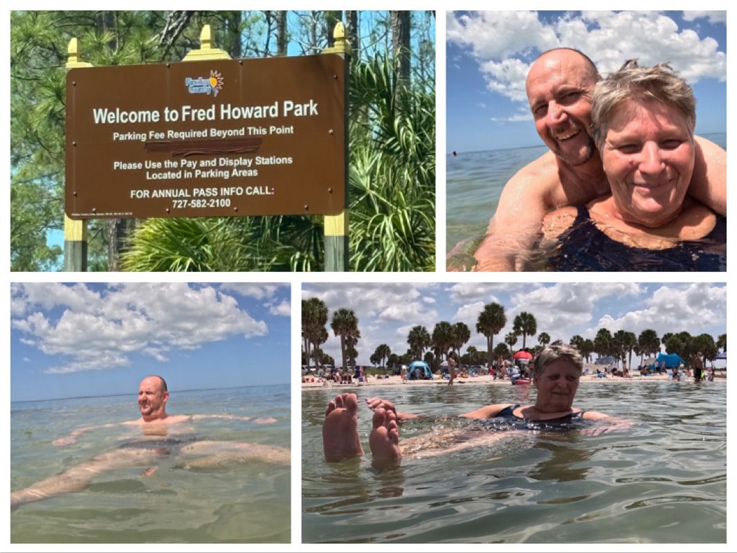 Efter godt to timer nåede vi til Fred Howard Park Beach - en lille bitte ø, hvor der lavet en lille tange med en vej ud til. På midten af denne lille ø er der et par hundrede parkeringspladser, og så den fineste strand omkring. Der var stadig ledige pladser, og man betaler $6, og så må man holde til parken lukker ved solnedgang. Et par timer i fuld sol, 26 grader og uv-indeks på 8 er nok til et par vinter-bleg-fede danskere med faktor 50 solcreme. Vi var i vandet, det var virkelig dejligt.