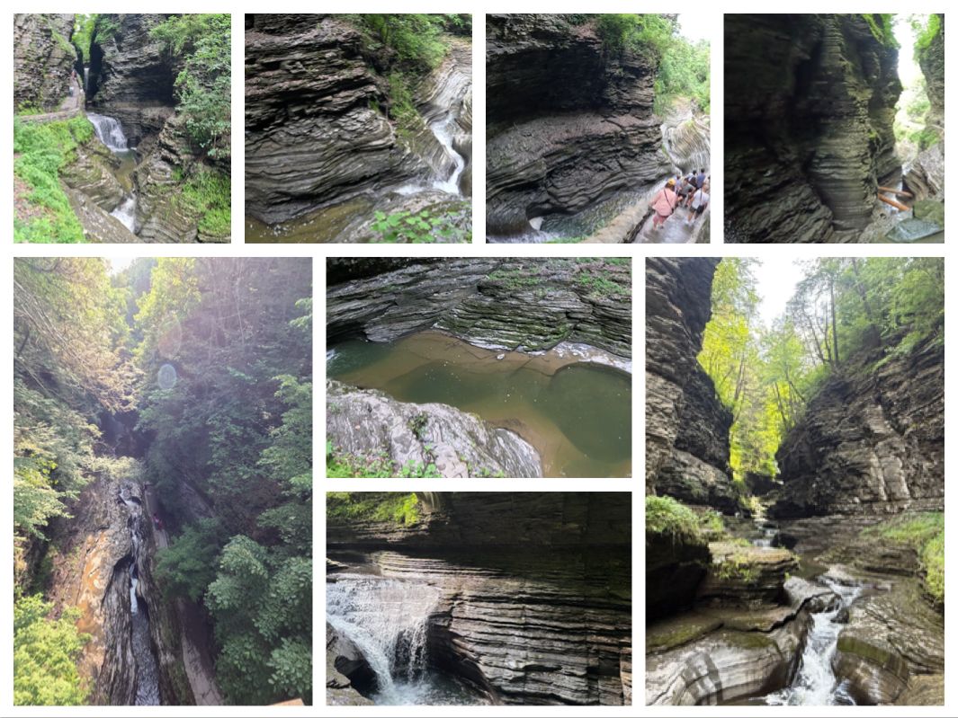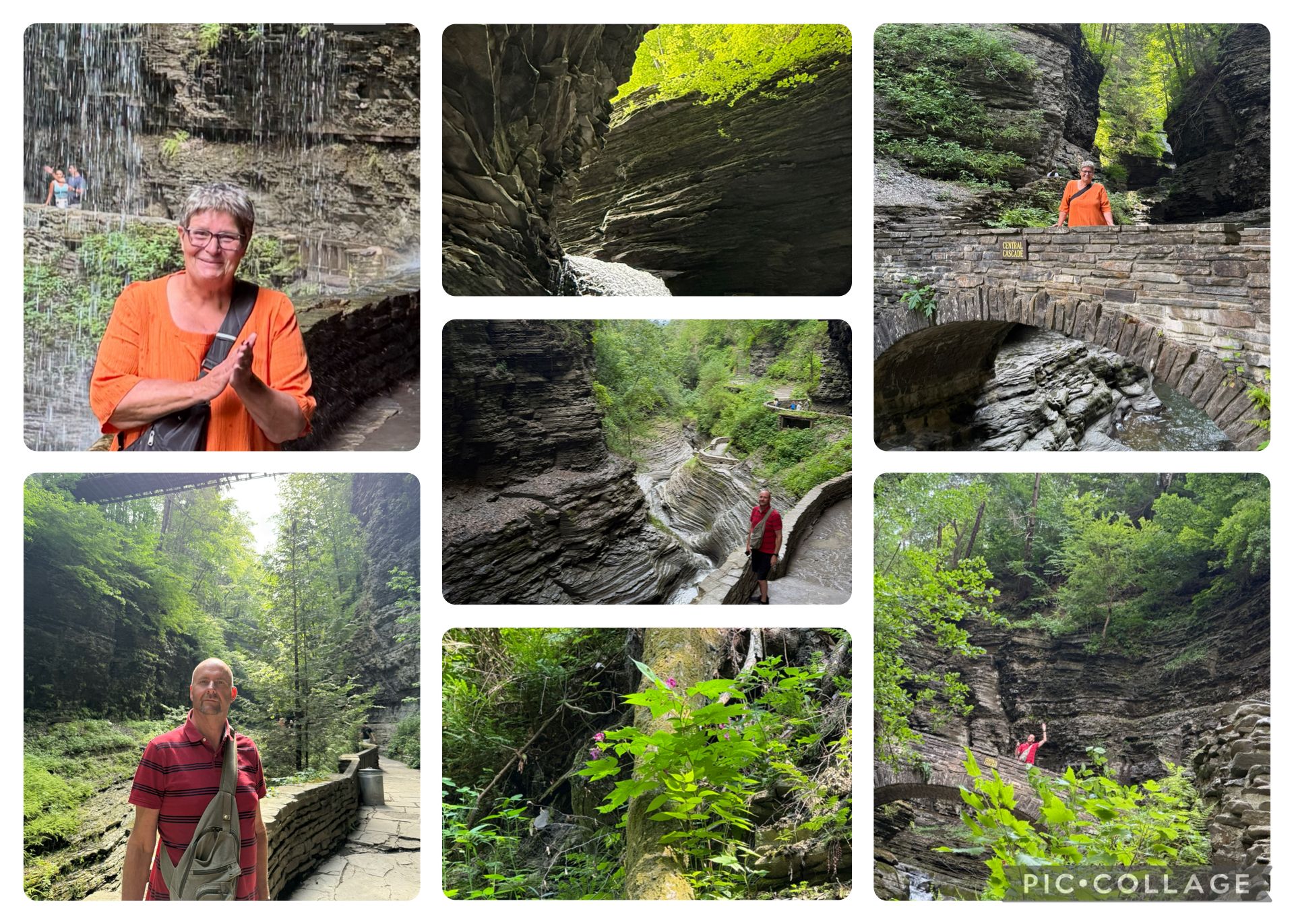 Knap 45 minutter efter var vi ved næste stop - Watkins Glen State Park. Det blev bare en kæmpe naturoplevelse. Der går en “trail” op af diverse glatte og mudrede trapper og stier. Den er 3 kilometer lang og kommer forbi, under og over 19 vandfald. Tror vi sagde Wauh og neeeejjj og se der for hvert 5 minut, så det blev en lang tur på et par timer. Sikke en smuk natur med en flod med masser af vandfald, der har skåret sig ned gennem klipperne til en slags kløft. Der var også masser af grønt. Det var nogle virkeligt smattede stier man gik på flere steder, og vi havde jo som sædvanligt virkelig gode vandresko på.